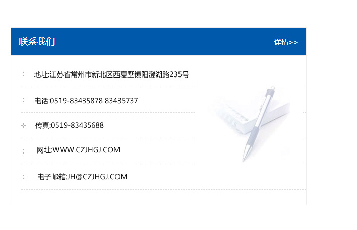 地址:常州市新北區友邦商務大廈1幢16、17層  電話:0519-85101652  傳真:0519-85112595  郵編:213022  網址:www.cz-jiayue_cn.mzjyzs.com  郵箱:xiajifengaa@163.com
